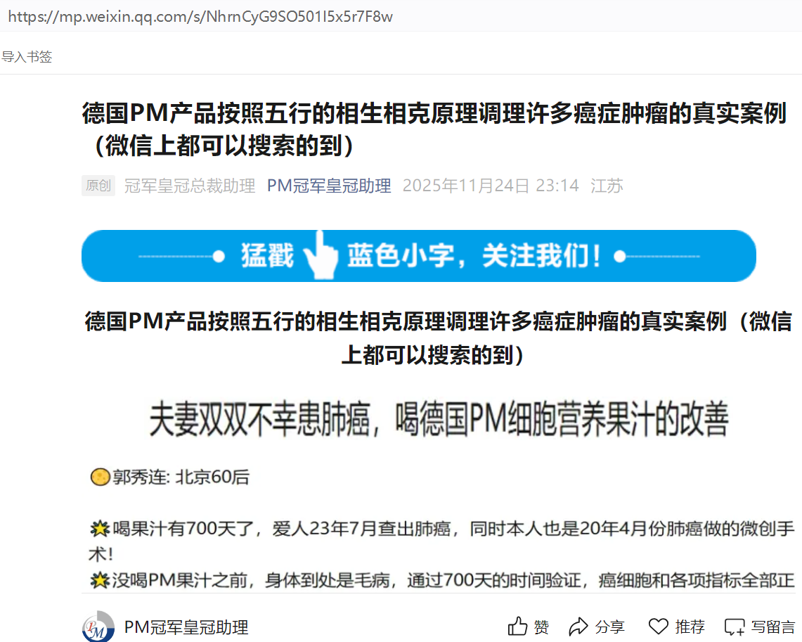 七、德国PM产品按照五行的相生相克原理调理许多癌症肿瘤的真实案例(微信上都可以搜索的到) https://mp.weixin.qq.com/s/NhrnCyG9SO501I5x5r7F8w